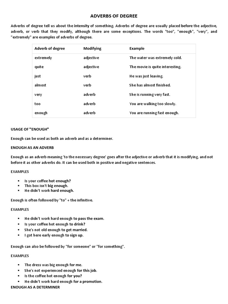 Adverbs Of Degree English Grammar A1 Level from open.books4languages.com We did not find results for: Maybe you would like to learn more about one of these? Adverb of degree examples sentences. Check spelling or type a new query.